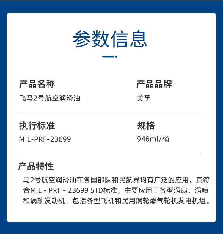 美孚飞马2号滑油由高稳定合成性基础油和独特添加剂组合调配而成,使产品具有优良的热与氧化安定性,可以防止油品在气相和液相状态时变质劣化和产品沉积以及产生泡沫。它具有高的热容量,可保证从发动机油冷部件处良好的热量传递。在高温下,蒸发率很低,足以防止油品的过量损失。