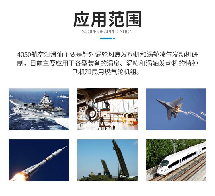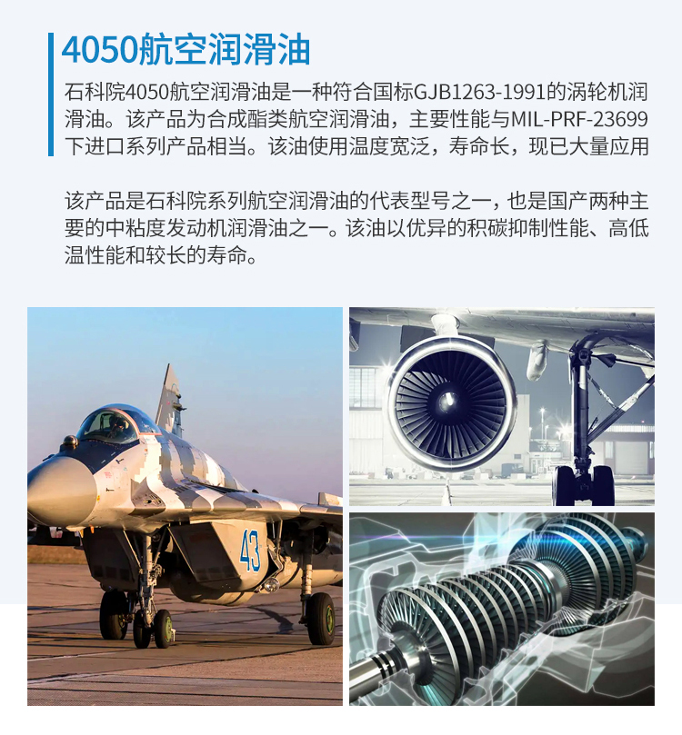 是石科院生产的、满足国军标GJB 1263-1991的国产高温合成航空润滑油。4050油的的组成是新戊基多元醇酯外加抗氧剂、抗腐蚀剂和抗泡剂等添加剂。其主要是针对涡轮风扇发动机和涡轮喷气发动机研制,目前主要应用于各型装备了涡扇、涡喷和涡轴发动机的军用飞机和民用燃气轮机组。