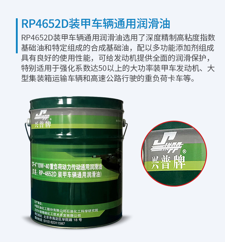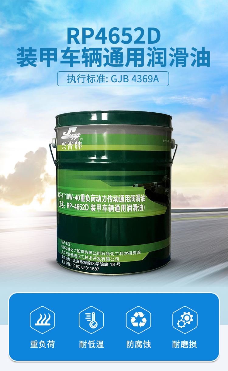RP4652D装甲车辆通用润滑油选用了深度精制高粘度指数基础油和特定组成的合成基础油,配以多功能添加剂组成。RP-4652D装甲车辆润滑油具有良好的使用性能,可给发动机提供全面的润滑保护,特别适用于强化系数达50以上的大功率装甲车发动机、大型集装箱运输车辆和高速公路行驶的重负荷卡车等。