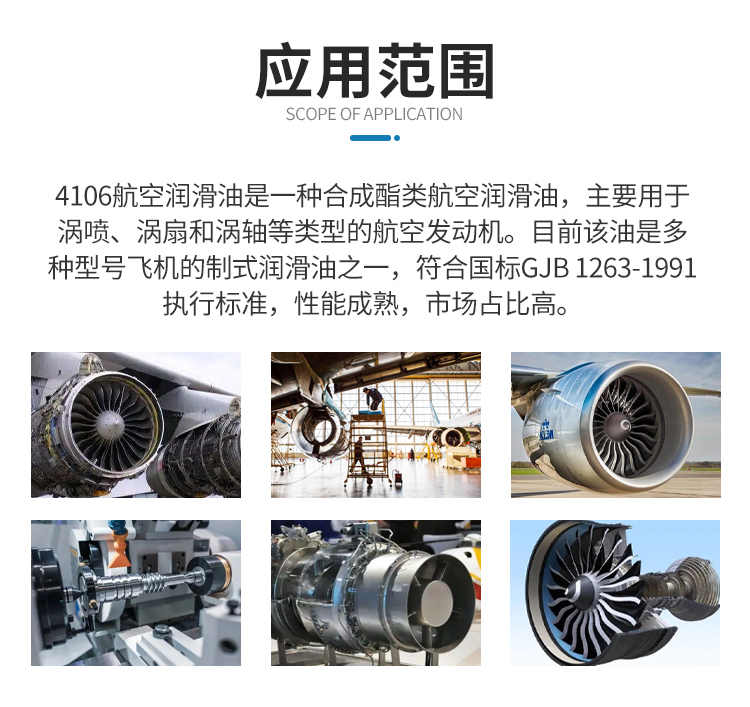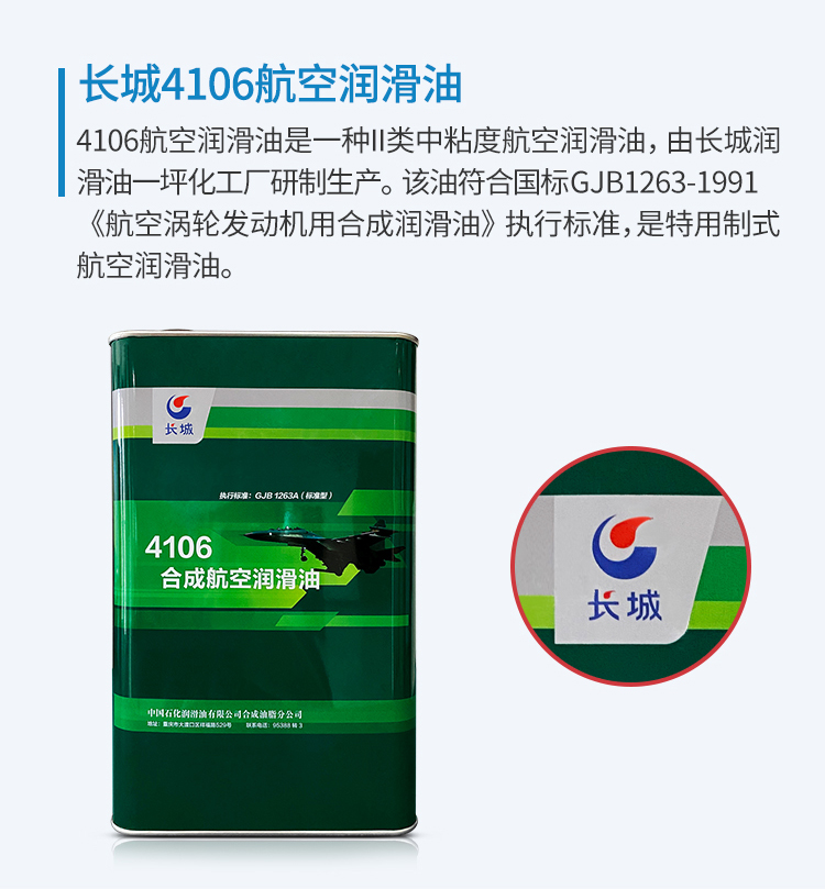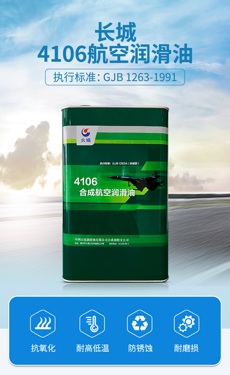 长城润滑油一坪厂生产的4106航空润滑油是一种合成酯类航空润滑油,主要用于涡喷、涡扇和涡轴等类型的航空发动机。目前该油是部队多种型号飞机的制式润滑油之一,符合国军标GJB 1263-1991执行标准,性能成熟,市场占比高。