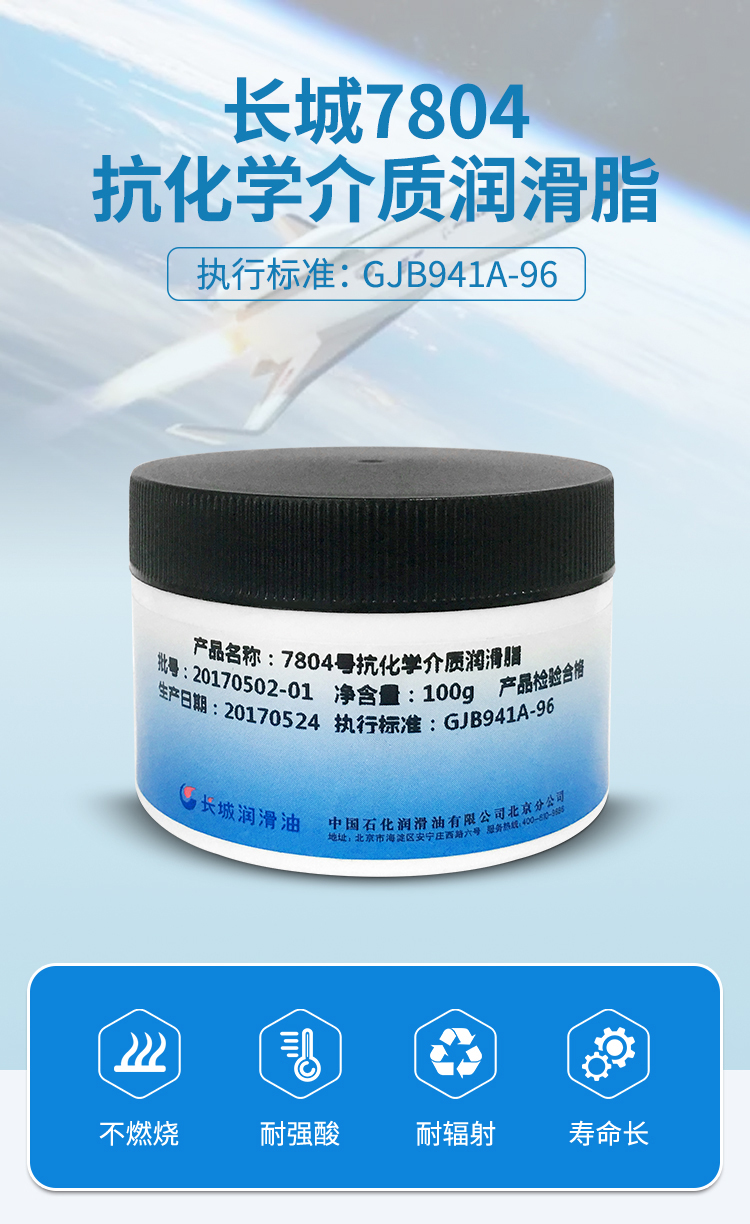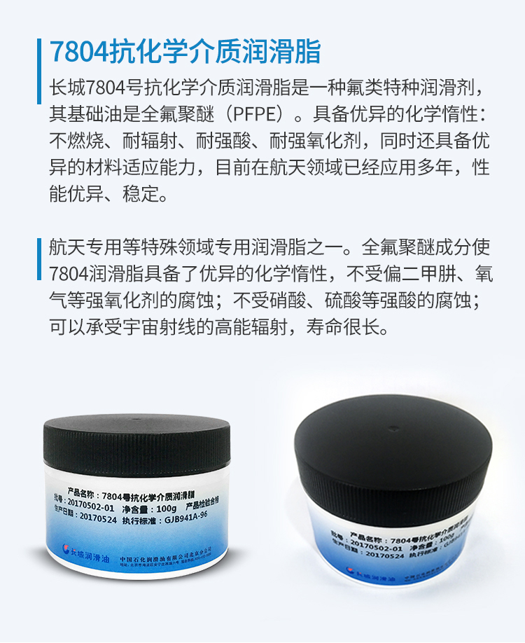 航天专用等特殊领域专用类润滑脂之一。全氟聚醚成分使7804润滑脂具备了优异的化学惰性,不受偏二甲肼、氧气等强氧化剂的腐蚀;不受硝酸、硫酸等强酸的腐蚀;可以承受宇宙射线的高能辐射,寿命很长。