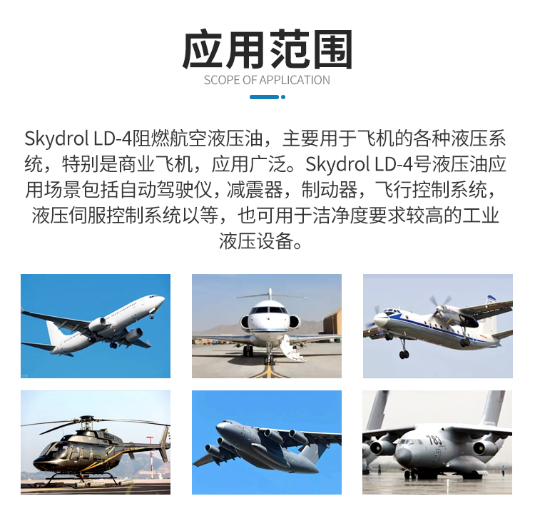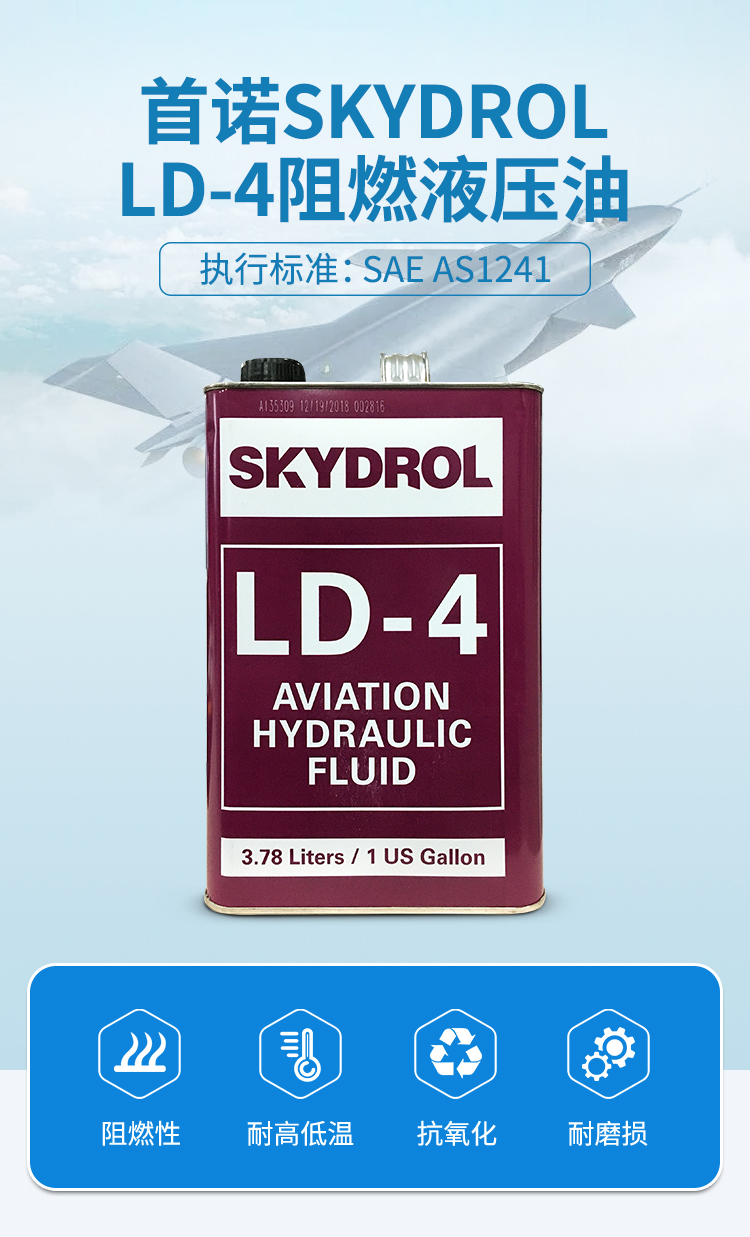 除了Skydrol LD-4之外,河南航材还能为您提供符合AS 1241 V类标准的Skydro 5、Skydrol PE-5型阻燃液压油,欢迎致电选购!
