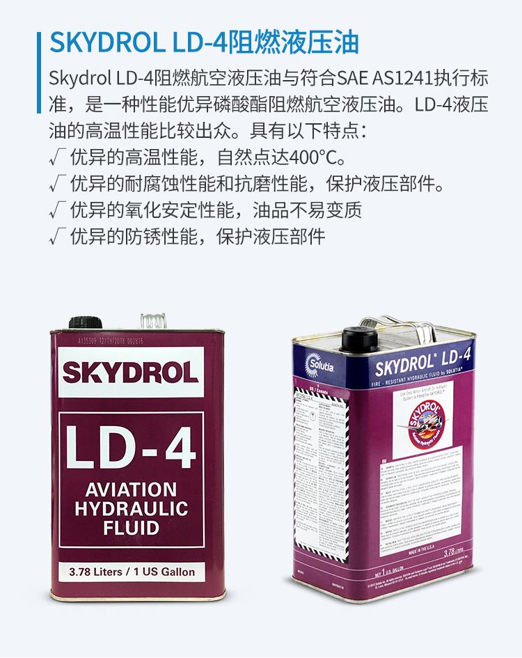 Skydrol是Eastman的子公司,专注于磷酸酯类阻燃液压油的研发和生产,至今已有80年历史。Skydrol LD-4是一种符合美国工程师协会SAE AS 1241 IV型执行标准的航空液压油,被广泛应用于各类民航、通航飞机和军航、直升机、运输机等。该产品的闪点可达175℃,比传统的矿物型航空液压油(10号、15号、壳牌41等)高出60℃。因此其高温耐燃/阻燃性能优良。