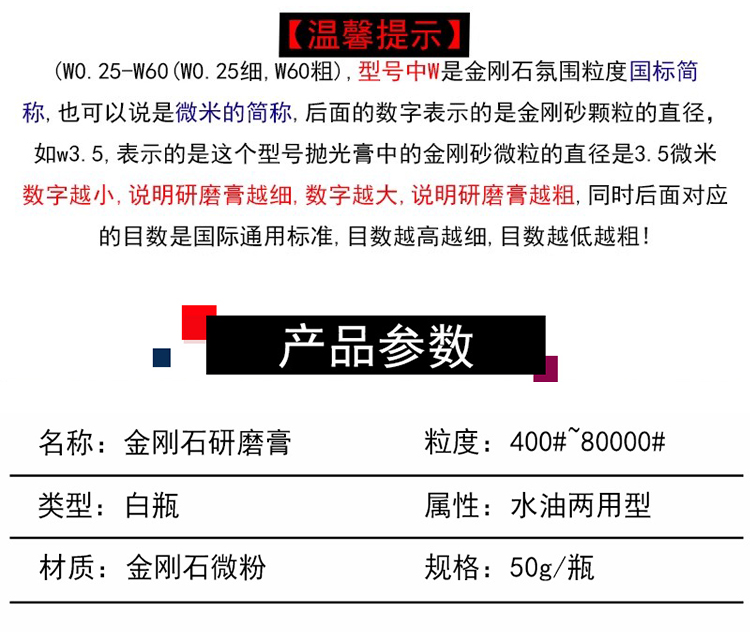 金刚石研磨膏适用于翡翠、玛瑙、水晶、玉石,琥珀等工艺品、陶瓷硬质合金等高硬度材料制品的量具、刃具光学仪器及其他高光洁度工件的研磨,抛光加工。