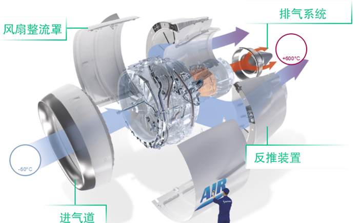 在飞机的动力系统中,大家见到最多的就是飞机短舱系统,也就是包裹在航空发动机外面的白色圆筒。这个部位由进气道、风扇整流罩、反推装置、排气系统四大部分组成,它为发动机工作提供所需工作环境,可以说是发动机的房子。
