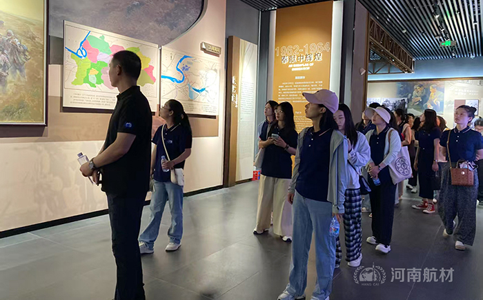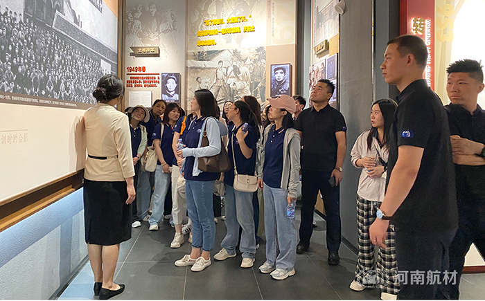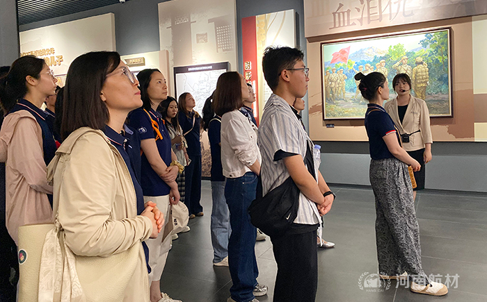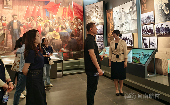 在描绘兰考盐碱大地旧貌的地图前,在陈列泛黄党报的展柜旁,员工们驻足细览。