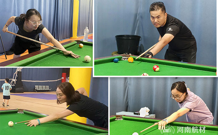 台球桌成为他们的竞技场,袁总一袭黑衣修身勾勒沉稳气场,俯身架杆似磐石,视线锐利穿透彩球轨迹。球杆疾推白球冲出,这是策略与技术的完美结合!场边的伙伴或静观沉思,或跃跃欲试,沉稳之中见锋芒,正是航材人工作中的细致底色。